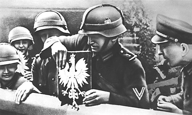 Гитлеровцы срывают польский герб. Польско-германская граница, сентябрь 1939 года.