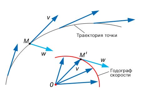 Если скорость точки является величиной, изображаемой переменным вектором v, то, отложив значения, которые имеет вектор в различные моменты времени, от некоторой общей точки O, получим годограф скорости. При этом направление касательной к годографу будет соответствовать ускорению точки w.