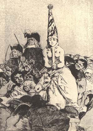 Франсиско Гойя. «Капричос» № 24. «Тут ничего нельзя было поделать. Эту святую сеньору жестоко преследуют. Огласив историю ее жизни, ей устраивают триумф. Ей воздают по заслугам. Но если это делают, чтобы устыдить ее, то зря теряют время. Невозможно устыдить того, кто не знает стыда».