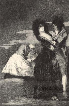Франсиско Гойя. «Капричос» № 5. «Один другого стоит. Немало было споров о том, кто хуже: мужчины или женщины. Пороки тех и других происходят от дурного воспитания. Распутство мужчин влечет за собой разврат женщин. Барышня на этой картинке так же безрассудна, как и щеголь, беседующий с нею, а что до двух гнусных старух, то они друг друга стоят».