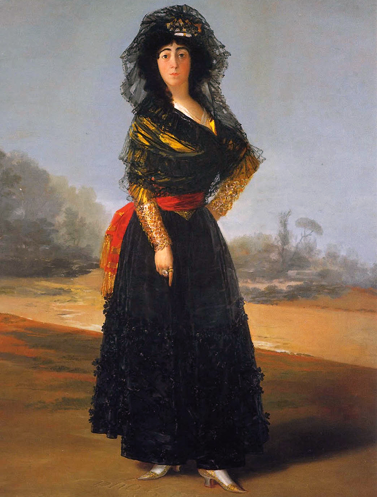 Франсиско Гойя. Портрет герцогини Альбы. 1797 год. Холст, масло. Испанское общество, Нью-Йорк. Этот портрет известен также под названием «Черная герцогиня» по цвету платья испанской махи. Рука герцогини указывает на надпись «Solo Goya» (Только Гойя). На кольцах, украшающих руку женщины, также надписи Goya и Alba. Эти детали указывают на близкие отношения между художником и аристократкой.