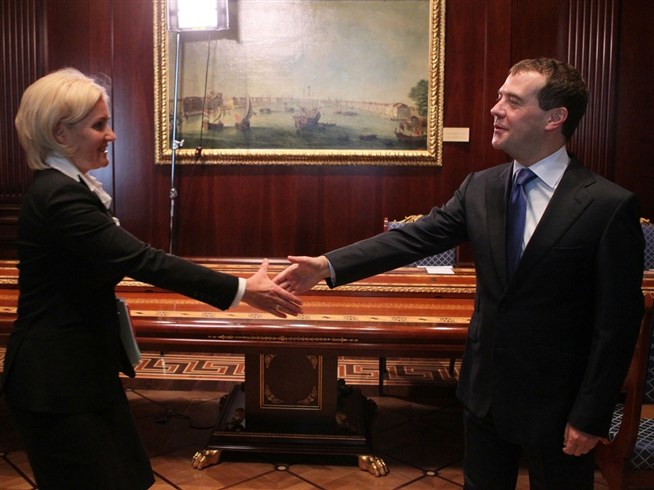 Председатель Правительства Российской Федерации Д.А.Медведев и заместитель Председателя Правительства Российской Федерации О.Ю.Голодец. 18 июня 2012 года. Сайт: