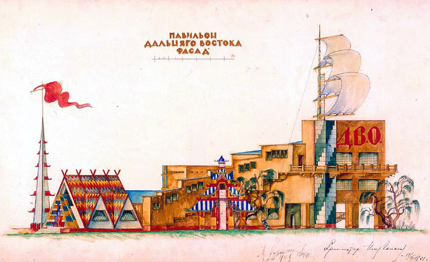 Эскиз павильона Дальнего Востока на Всероссийской сельскохозяйственной выставке в 1923 (осуществлен). Архитектор И. А. Голосов.