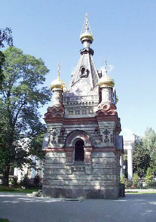 Гомель. Часовня-усыпальница Паскевичей. Возведена под руководством академика архитектуры Н. Червинского в стиле деревянных пятиглавых шатровых церквей. Богатое декоративное убранство. 1889.