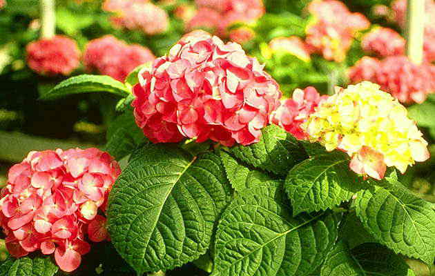 Цветущая гортензия крупнолистная (Hydrangea macrophylla).
