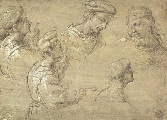 Франческо Граначчи. Этюд «Пять мужских голов» (1516-1520, грунтованная серая бумага; серебряный штифт, белила). Галерея Уффици, Флоренция.