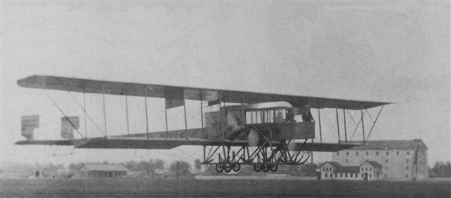 Аэроплан «Гранд» в полете. На «балконе» стоят Панасюк и Янковский, в кабине — Сикорский. Источник: Woodman H. The Sikorsky Grand. Aeroplane, March 2004.