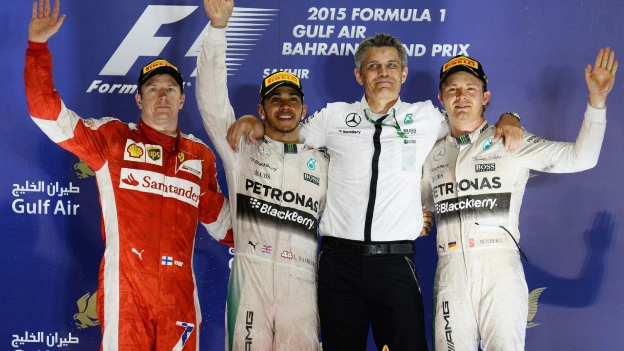 Подиум Гран-при Бахрейна: Кими Райкконен (слева), Льюис Хэмилтон (второй) и Нико Росберг (справа). Фото с сайта: www.formula-1.com