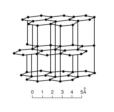Кристаллическая решетка графита: атомы C расположены по слоям, при этом слои взаимно смещены так, что они симметрично повторяются через один. Связь между атомами прочная, ковалентного типа; между слоями – слабая, остаточно-металлического типа.