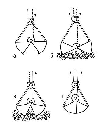 Схема работы двухканатного двухчелюстного грейфера: а — разгрузка; б — опускание на материал; в — захват материала; г — подъем.
