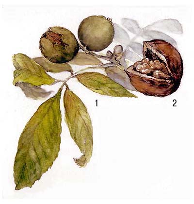 Грецкий орех: 1 — ветвь с плодами; 2 — вскрытый плод.