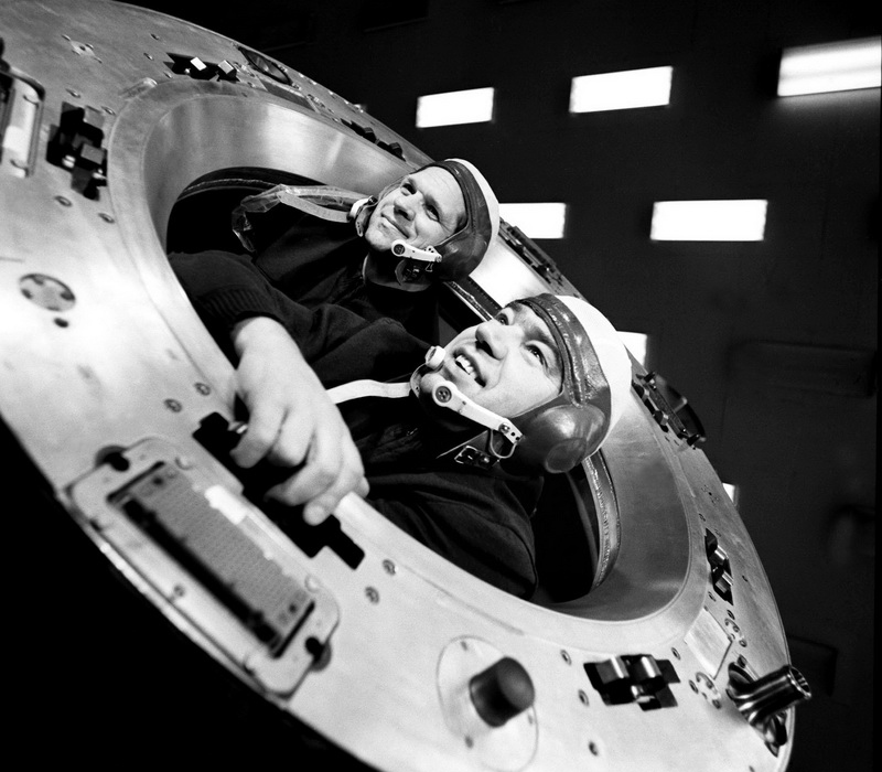 Командир экипажа орбитальной станции «Салют-4» Алексей Губарев (слева) и бортинженер Георгий Гречко во время занятий у переходного люка макета станции в Центре подготовки космонавтов в Звездном городке. 14 января 1975 года. Снимок Альберта Пушкарева.