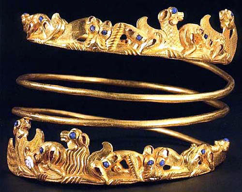 Шейная гривна, Вторая половина 1 в. н.э. Золото, стекло, ковка, литье, гравировка, инкрустация.