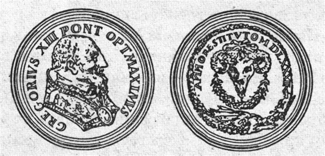 Медаль в ознаменование введения григорианского календаря. Надпись на лицевой стороне: «Григорий XIII наилучший верховный жрец»; надпись на оборотной стороне: «Год исправления 1582»