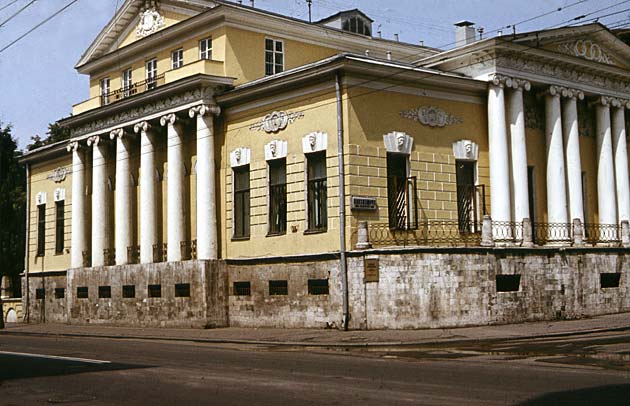 Дом Хрущовых-Селезневых (архитекторы А. Г. Григорьев, Д. И. Жилярди). Вид с улицы Пречистенки. Построен из дерева на каменном цоколе. Фасады украшены портиками ионического ордера.
