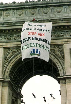 Акция «Гринпис», направленная против ядерных испытаний Франции в атолле Муруроа. Триумфальная арка. Париж.