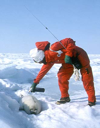 Акция «Гринпис» по защите тюленей. Активисты наносят несмываемую краску на шкуру белька, делая ее бесполезной для производства меховой одежды.