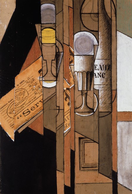 Х. Грис. Рюмки, газета и бутылка вина. 1913 год. Коллаж. Бумага, гуашь, цветные мелки, уголь. Частное собрание.