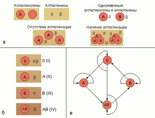 Групповые свойства крови: а) представление об агглютинации; б) группы крови (распределение агглютининов и агглютиногенов); в) упрощенная схема возможности переливания крови различных групп.
