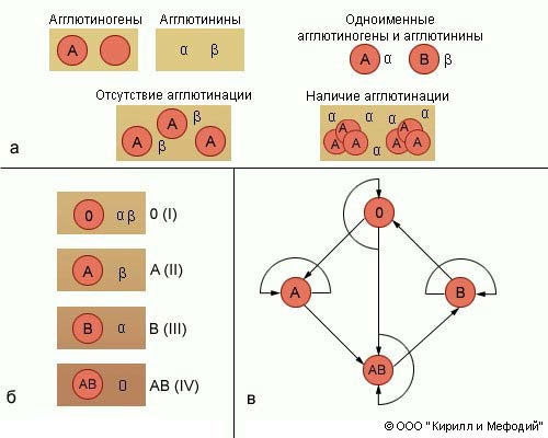 Групповые свойства крови: а) представление об агглютинации; б) группы крови (распределение агглютининов и агглютиногенов); в) упрощенная схема возможности переливания крови различных групп.