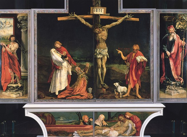 М. Грюневальд. Изенгеймский алтарь. Около 1515 года. Дерево, масло. Музей Унтерлинден, Кольмар. Справа от распятого Христа — Иоанн Креститель с книгой в руке, слева — коленопреклоненная Мария Магдалина, рядом с ней горшок с благовониями. За Марией Магдалиной — теряющая сознание Богоматерь, ее поддерживает Иоанн Евангелист. На правой створке — святой Антоний, на левой — святой Себастьян, внизу — сцена положения Христа во гроб.
