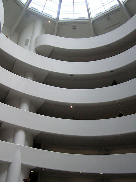 Посетители музея Гуггенхайма начинают просмотр сверху и по спирали спускаются вниз. Эту уникальную концепцию расположения залов предложил архитектор Ф. Л. Райт.
