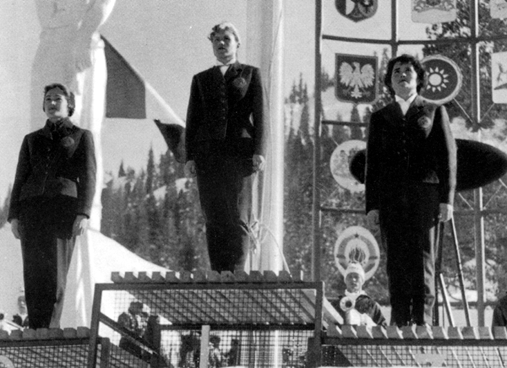 Мария Гусакова, Любовь Баранова-Козырева, Радья Ерошина — победительницы 10-километровой лыжной гонки на Играх в Скво-Вэлли.