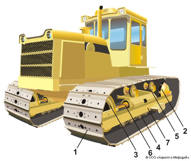 Схема гусеничного хода трактора: 1 – гусеницы; 2 – ведущие колеса; 3 – направляющие колеса; 4 – опорные катки; 5 – поддерживающие катки; 6 – натяжное устройство; 7 – подвеска.