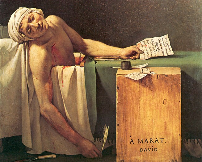 Луи Давид. Смерть Марата. 1793 год. Масло, холст. Королевские музеи изящных искусств, Брюссель. В руке Марата зажат листок с текстом: «13 июля 1793, Мари Анна Шарлотта Корде — гражданину Марату. Я несчастна, а потому имею право на вашу защиту». На самом деле Марат не успел получить записку — Корде убила его раньше. Надпись на деревянной тумбе — авторское посвящение: «Марату, Давид».