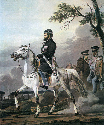 Д. В. Давыдов. Раскрашенная гравюра М. Дюбурга по оригиналу А. Орловского. 1814.