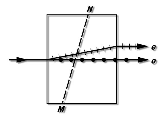 Двойное лучепреломление (схема): MN — направление оптической оси; о — обыкновенный луч; е — необыкновенный луч.