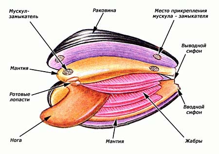 Тело моллюсков покрыто складкой кожи, или мантией. Между ней и телом образуется мантийная полость, в которой находятся органы дыхания - жабры. Мантия выделяет вещества, из которых образуется раковина.