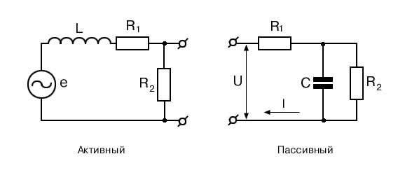 Схемы двухполюсников: активного, содержащего источник эдс, и пассивного – без источника эдс.