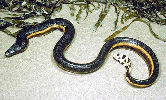 Двухцветная пеламида (Pelamis platurus) имеет очень контрастную окраску: темно-бурая, иногда черная спина резко отграничена от светло-желтого брюха..