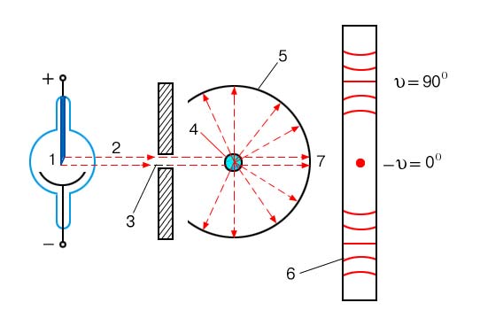 Схема съемки рентгенограммы по методу Дебая – Шеррера: 1 – рентгеновская трубка; 2 – пучок монохроматического рентгеновского излучения; 3 – диафрагма (щель); 4 – кристалл; 5 – фотопленка; 6 – рентгенограмма; 7 – след, оставляемый лучами, проходящими кристалл насквозь.