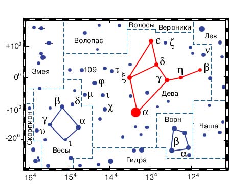 Созвездие Девы. В современную эпоху в нем расположена точка осеннего равноденствия. Наилучшие условия для наблюдения март – апрель.