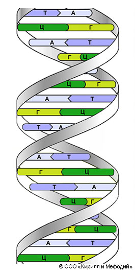 Фрагмент молекулы ДНК. Цепи состоят из остатков дезоксирибозы, фосфорной кислоты и азотистых оснований, обращенных внутрь молекулы. Двойная спираль устойчива благодаря водородным связям, образующимся между аденином и тимином (А-Т) и гуанином и цитозином (Г-Ц).