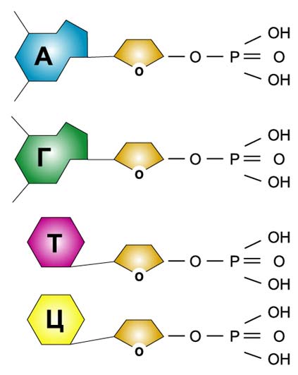 Нуклеиновые кислоты представляют собой биополимеры, построенные из молекул-мономеров - нуклеотидов. Каждый нуклеотид состоит из азотистого основания, углевода и остатка фосфорной кислоты. В образовании молекулы ДНК принимают участие углевод дезоксирибоза, остаток фосфорной кислоты и четыре азотистых основания: аденин (А), гуанин (Г), цитозин (Ц) и тимин (Т).