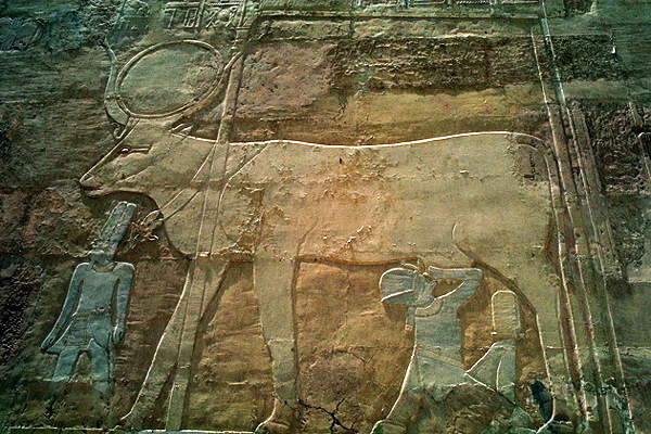 Погребальный храм царицы Хапшепсут в долине Дейр-эль-Бахри. Рельефное изображение богини Исиды в виде коровы. Архитектор Сененмут. Ок. 1490-1468 гг. до н. э.