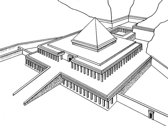 Заупокойный ансамбль Ментухотепа II. Реконструкция. Фараон Ментухотеп II построил свой заупокойный храм, соединив пирамиду со скальной гробницей. XI династия. 21 в. до н.э. Дейр-эль-Бахри.