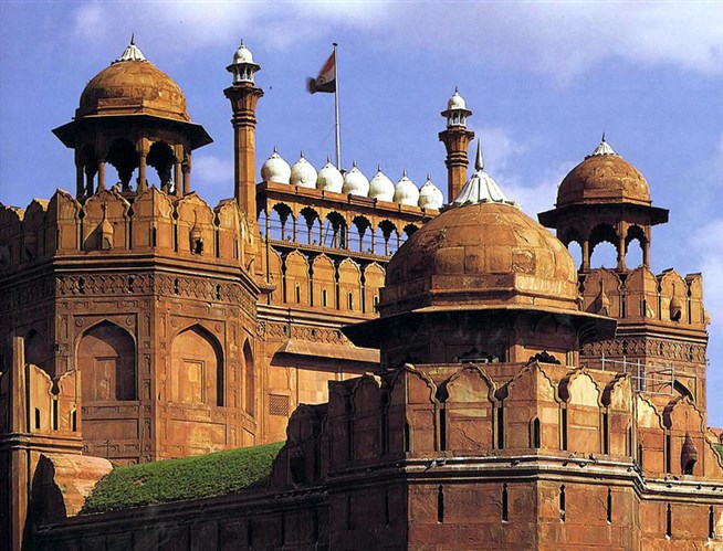 Башни и стены Красного форта, построенные из красного известняка, контрастируют с выкрашенными в белый цвет маковками, укращающими верхние части башен.