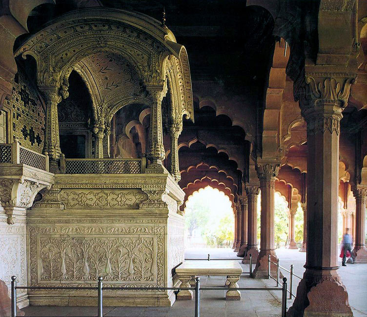 Красный форт. Беломраморная императорская ложа Курси в зале Диван-и-Ам, перед которой располагается мраморная скамейка главного визиря.