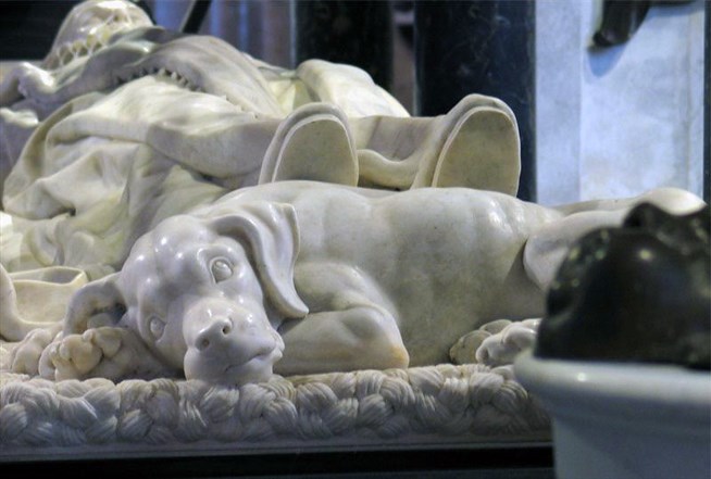 Делфт. Надгробие могилы Вильгельма Оранского в Новой церкви. В ногах принца изображен его верный пес, который, по легенде, после смерти хозяина отказывался есть и пить и вскоре умер от тоски.
