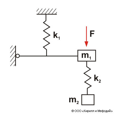 Схема демпфирования колебаний механической системы. Демпфирование колебаний в механической системе m1, k1, на которую действует периодическая внешняя сила F, осуществляется демпфером, состоящим из массы m2, колеблющейся на пружине k2. Это происходит в результате такого подбора параметров, при котором возникающие собственные колебания уравновешивают внешнюю силу.