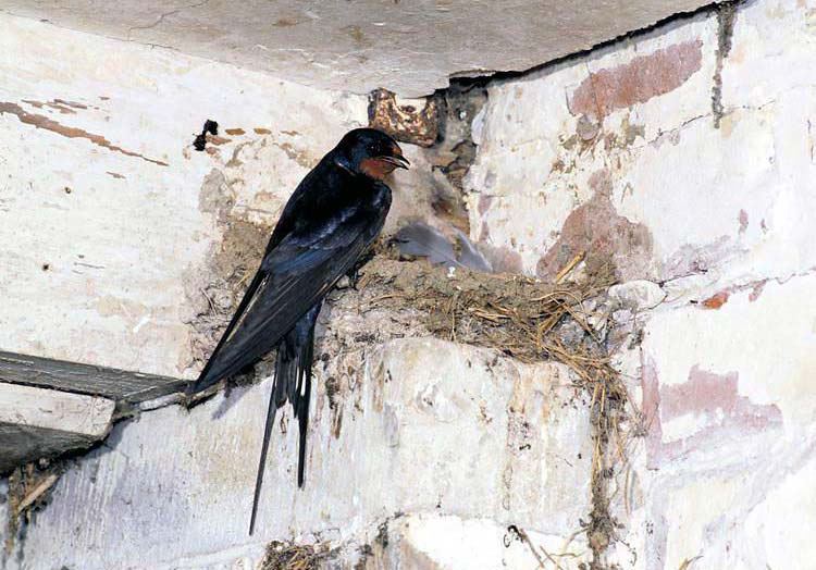 Деревенская ласточка строит под навесом прикрепленное боком к вертикальной поверхности и открытое сверху чашеобразное гнездо.
