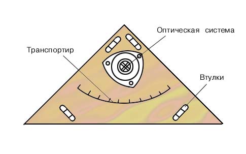 В вершине прямого угла расположена колонка с оптической системой для точной установки дериватора, параллельно катетам закреплены втулки, через которые наносят метки для проведения касательной или нормали к заданной кривой.