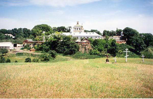 Дермань. Вид на развалины крепости и Троицкую церковь.