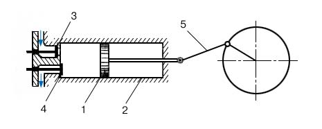 Схема поршневого детандера: 1 – поршень; 2 – цилиндр; 3 – впускной клапан; 4 – выпускной клапан; 5 – кривошипно-шатунный механизм.