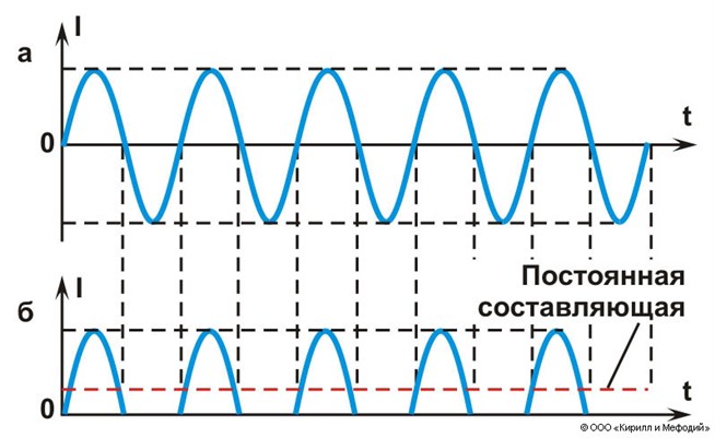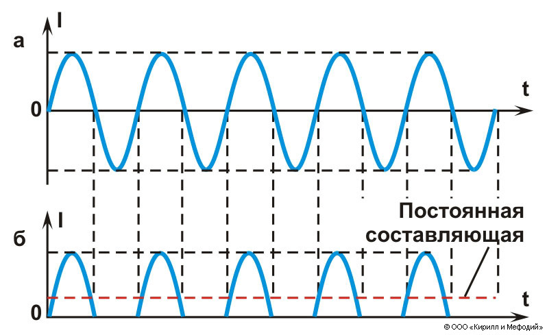 Детектирование: а – колебания с постоянной амплитудой до детектирования (на входе детектора); б – импульсы тока I после детектирования (на выходе детектора). Детектор регистрирует постоянную составляющую тока.
