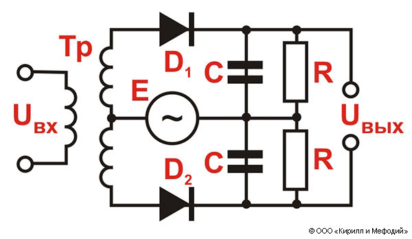 — полупроводниковые диоды; E — источник опорных колебаний; C — конденсатор и R — резистор, составляющие нагрузку детектора; UВх — входное напряжение; UВых — выходное напряжение.
